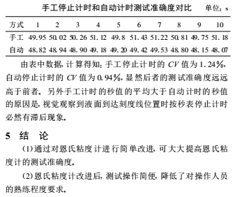 恩氏粘度計(jì)采用人工卡秒表的方式計(jì)時(shí), 這樣就存在人為的操作誤差。 另外, 操作人員需用肉眼監(jiān)視量瓶中流入漿液的液面是否到達(dá)刻度線(xiàn)位置, 以停止秒表計(jì)時(shí) , 這也勢(shì)必存在著視覺(jué)誤差。 操作誤差和視覺(jué)誤差必然導(dǎo)致其測(cè)試準(zhǔn)確度低。為盡量減小這些誤差, 操作人員需經(jīng)過(guò)長(zhǎng)期訓(xùn)練, 而且**好能長(zhǎng)期固定檢驗(yàn)人員, 不同檢驗(yàn)人員測(cè)得的數(shù)據(jù)的可比性較差。3 提高恩氏粘度計(jì)測(cè)試準(zhǔn)確度的措施