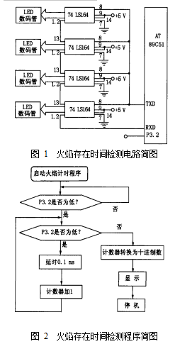 石油產(chǎn)品閃點溫度下的閃火火焰的存在時間是閃點檢測儀表電路設計的重要參數(shù), 為測出火焰存在時間, 筆者利用 AT89C51 制成一臺火焰存在時間檢測裝置, 其電路簡圖如圖 1 所示, 主要流程圖如圖 2 所示。