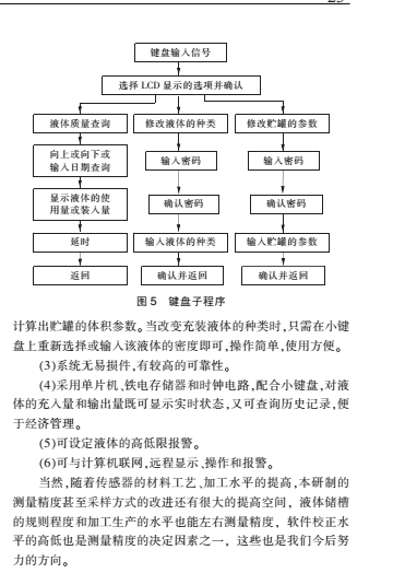 [9-11]。 LCD 可直接顯示液體的種類、質(zhì)量和液面高度。 貯罐規(guī)格改變時(shí),輸入其內(nèi)徑和高度便可得到其體積參數(shù)。 液體種類改變時(shí),只需在鍵盤上重